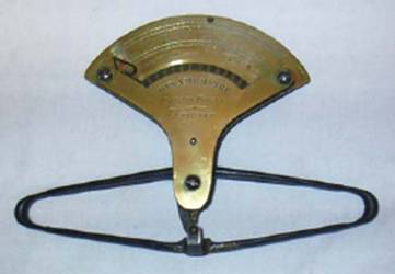 Dynamometer (pictured left). This is a 19th century medical instrument,  which is very hard to find. On the instrument are 2 different engraved scales:  the first one is ‘force ord-re des reins’ and the second is ‘force ord-re des  mains.’ On the left of the instrument there is a inscription: Echelle de  Tirage. Also on the left there is the inscription: Echelle de Pression. On the  upper right side of the instrument is engraved a kilograms scale and a little  stamp with the initials H.M. and the date 1877. In the middle of the instrument  the word DYNAMOMETRE is engraved, as well as ‘pour les forces, Charriere.’ The  large lozenge shaped spring still has its original leather cover. It is in full  working order. In my collection, the dynamometer is mounted on a hardwood base  to better display it. The large iron spring is approx. 9.5 inches wide (24  centimetres) and approx. 2.2 inches high (5,5 centimetres). Total height of the  instrument measured from the base of the iron spring to the top of the brass  part is 6.1 inches (15,5 centimetres). Joseph-Frederic-Benoit Charriere  (1803-1876): Paris Surgical Instrument Maker  from Switzerland.  This dynamometer is very similar to the Regnier dynamometer.