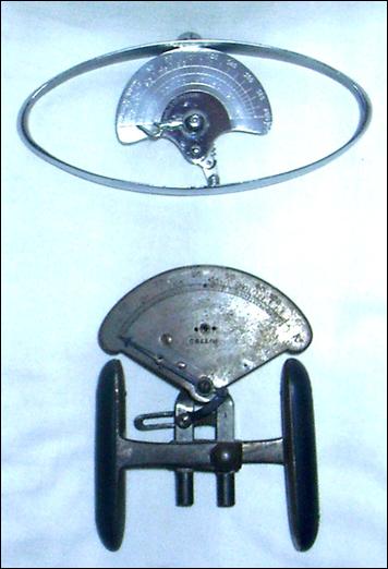 Hand dynamometer. c.1900-20. Dial has a 120k range, but  this gripper only goes up to 60kg, possibly due to the weakening of the spring.  Many old time strongmen have tested their hand strengths on a Collin gripper,  and the results are in David Willoughby’s books and articles. However, I  believe many, if not all, were done on a Collin’s type dynamometer,  which consists of a single oval elliptical spring about 5 inches long. I have  two of these medical type dynamometers, one a Medicon, and one unnamed, and  these will be mentioned later. (See the picture to the left to note the  difference)