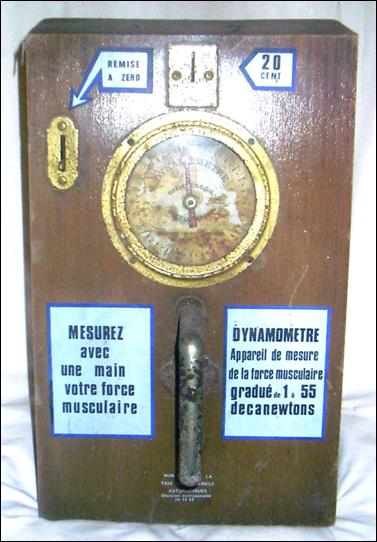 Dynamometre. French. Graduates from 1 to 55 decanewtons.  Marked ‘Brevete S.G.D.G.’ and has a transferred date of 1969. Takes a  20-centime coin to work. This is a lovely test-your-grip machine, and works  perfectly, although it does need some renovating. (Pictured left)