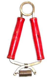 ‘Heavy’ Gripper. Early. Knurled. Swapped from Joe Roark, August 2001.  Coloured red. Wide handle spread, 10.4 cm!